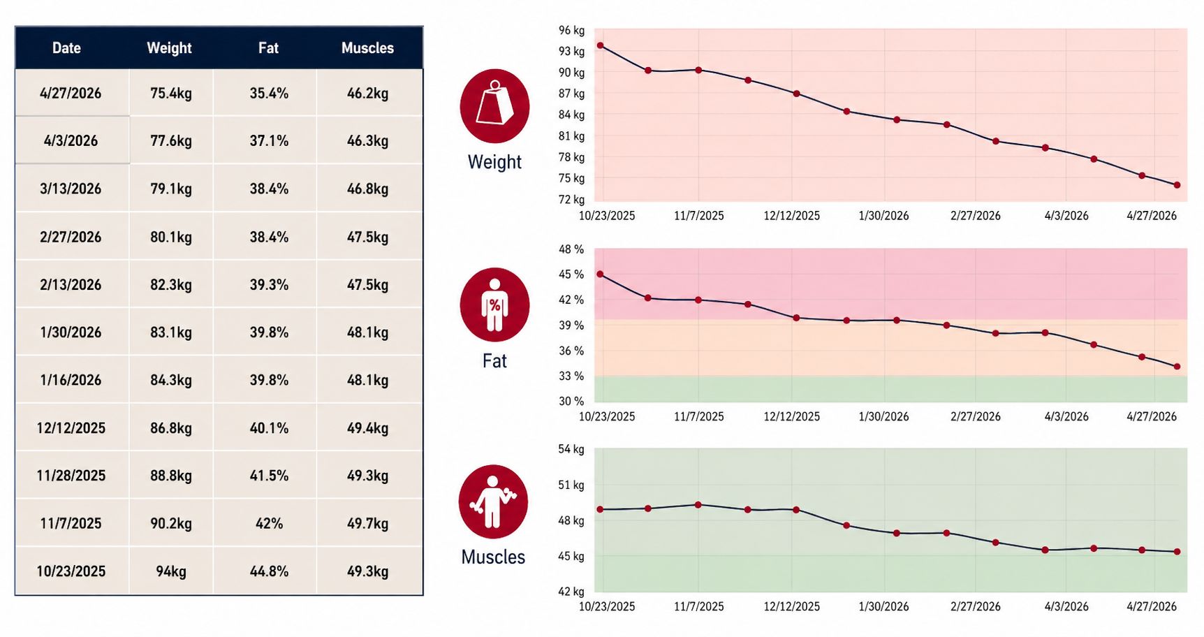 Se pot observa pe graficul expus și pe valorile înregistrate pe întregul parcurs modificările progresive ale greutății și ale compoziției corporale, ceea ce oferă o imagine obiectivă a transformării în timp.