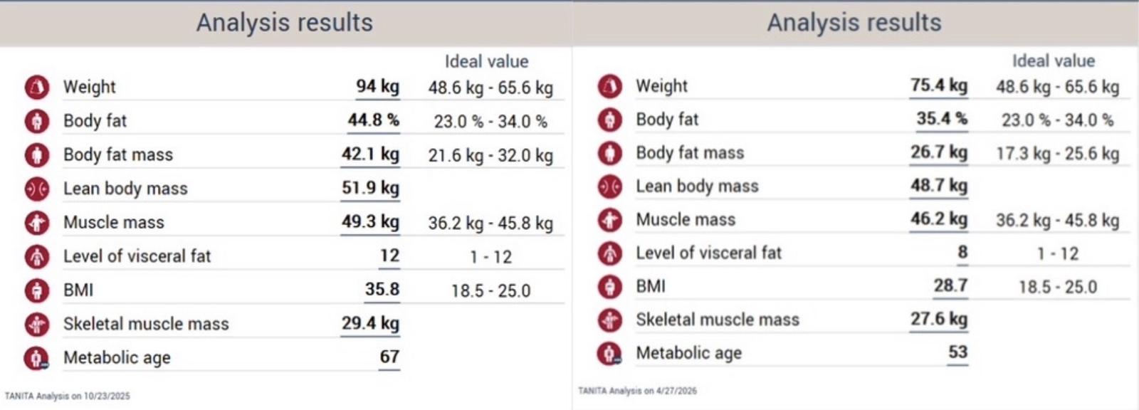 În decurs de aproximativ 6 luni, prin consecvență, monitorizare atentă și ajustări progresive ale planului nutrițional, s-a ajuns la o evoluție semnificativă: aproximativ 20 kg pierdute, cu o greutate actuală de 75,4 kg și reducerea procentului de masă grasă până la 35,4%.